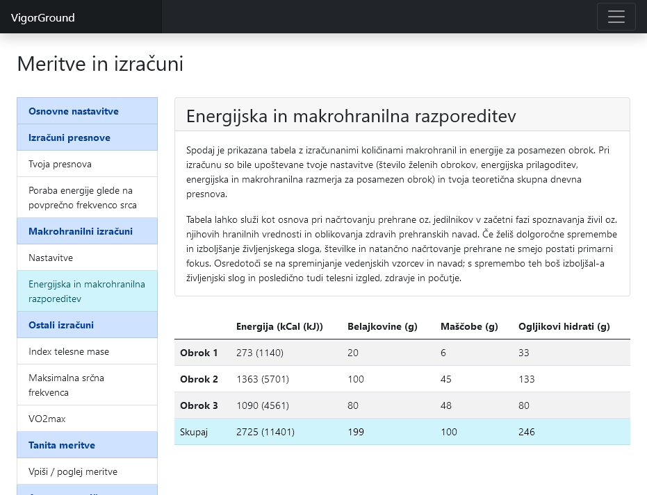 Izračuni in meritve. S programom dobite tudi dostop do aplikacije za izračun presnove, makrohranilne izračune in antropometrične meritve.